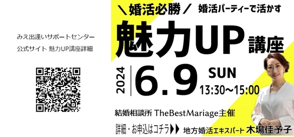 結婚相談所を運営するザベストマリアージュ(所在地:三重県伊勢市、代表:木場 佳予子)は、独身男性・女性を対象とした\婚活必勝/魅力UP講座を6月9日(日)に三重県・松阪市のCAFE Knulp(カフェクルヌプ)にて行います。