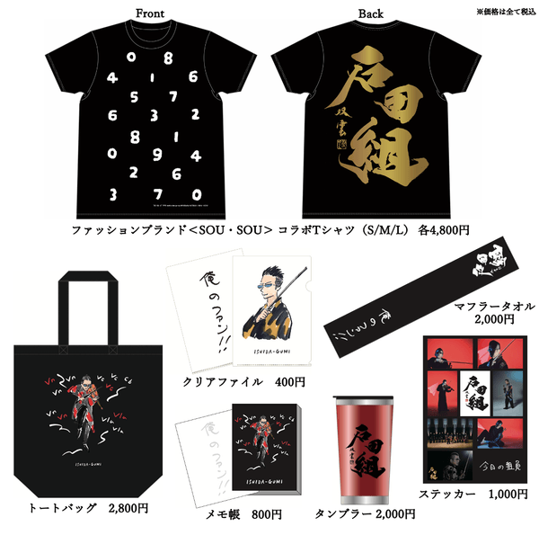 石田組組長の石田御用達でもある京都のファッションブランド<SOU・SOU>(ソウソウ)とコラボしたTシャツを始め、石田組の公演で、必ず組長が発する言葉「俺のファン」が組長の直筆でプリントされたマフラータオルや、イラストレーター・岡崎マリーが描いた組長のイラスト入りトートバッグ、クリアファイルなど、ファン必見のオリジナルグッズ!6月2日(日)大阪公演(フェスティバルホール)の会場で販売されるほか、オンラインでの販売も決定。ぜひ『石田組』グッズを身につけてコンサートを楽しもう!