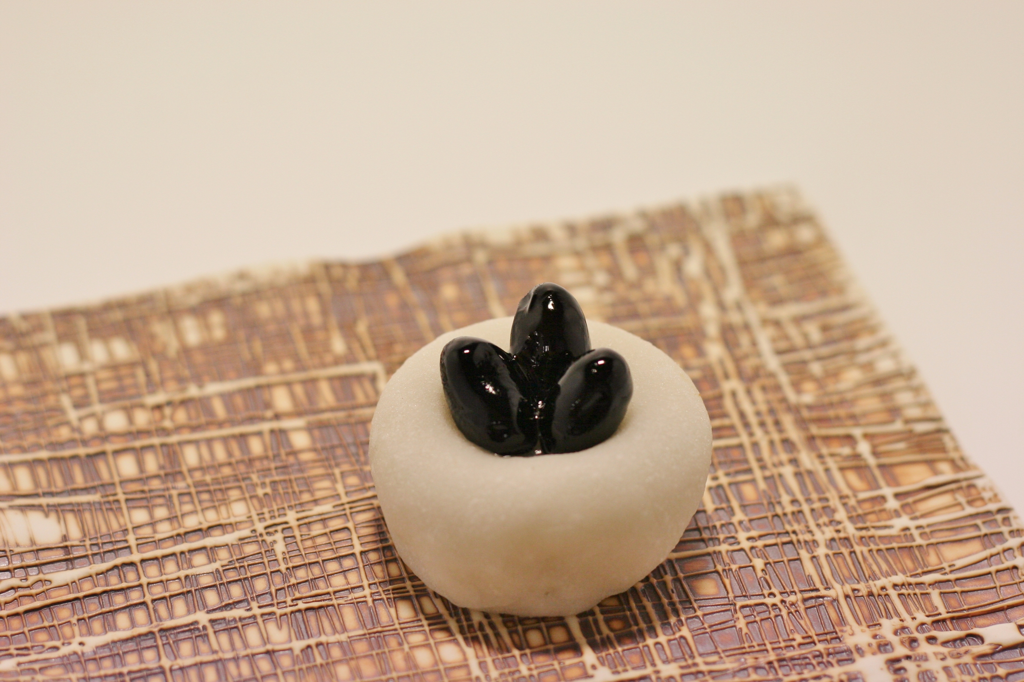 羽根二重生地で豆乳餡を包み込んだ餅菓子。黒豆を添え、白と黒のコントラストをはっきりさせ、『大人モダン』を表現。豆乳をふんだんに使い、ヘルシー感のある菓子