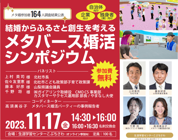 一般社団法人メタバース婚活協会(本社東京都渋谷区、支所山梨県笛吹市、代表理事:高須美谷子)は、 国の掲げる「異次元の少子化対策」の意見交換の場として、2023年11月17日(金)に生涯学習センターこぶちざわにて、オンライン併用のシンポジウムを開催します。