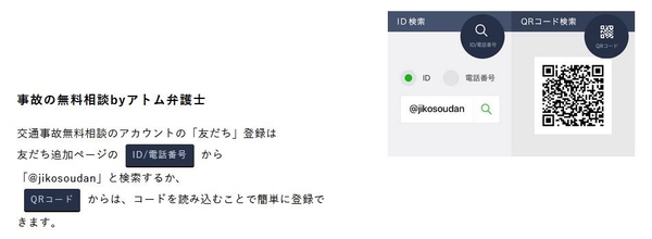 ①ID検索またはQRコードを読み取り、事故の無料相談byアトム弁護士/刑事事件の無料相談byアトム弁護士のLINEアカウントを「友だち追加」