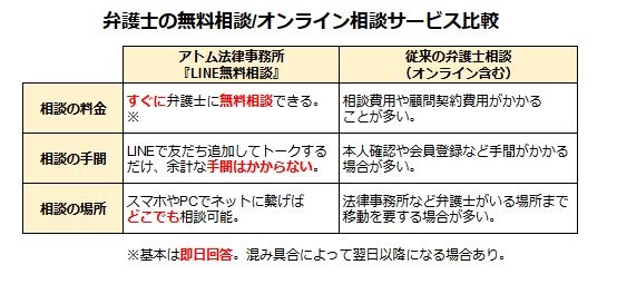2015年4月にアトム法律事務所弁護士法人(第二東京弁護士会、代表社員:岡野武志)が開始したLINEで無料法律相談を行うサービスです。