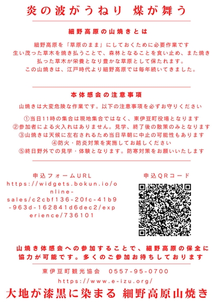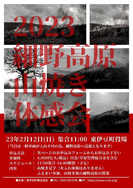 一般社団法人東伊豆町観光協会(所在地:静岡県賀茂郡東伊豆町:代表理事 加藤昌利)は2023年2月12日(日)、天城山脈に連なる東伊豆町のジオスポットの細野高原で「細野高原 山焼き体感会」を開催します。
