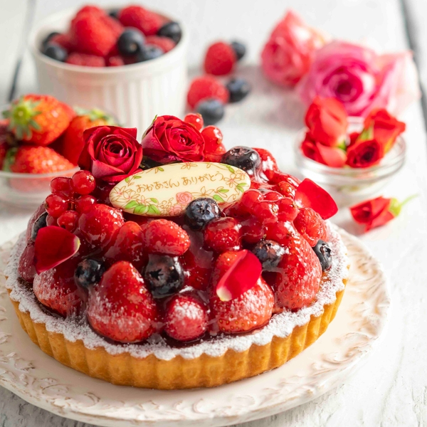 バター香るサクッと香ばしいアーモンドのタルトに、自家製カスタードクリームを重ね、甘く強く赤色が美しい栃木県産『とちあいか』と赤いベリーたっぷり乗せました。華やかなローズを飾った母の日限定タルトです。