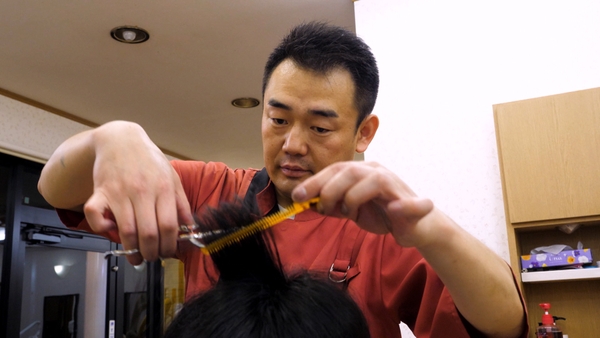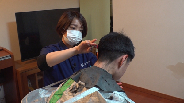 普通にカットをしているように見えますが、カットしやすい高さに調整できる美容院の椅子とはちがい、訪問先では高さ調整ができない椅子がほとんど。玉本さんが自ら立ったりしゃがんだりを繰り返してカットをしなければならず、無理な体勢が続いて腰痛になってしまうことも・・・。それでも「お客さんの笑顔で痛みを忘れてしまう」と玉本さん。10分後、無事にカットが終わりました。
