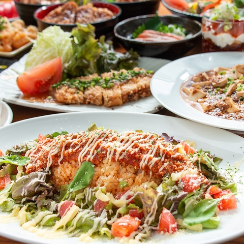 食べ放題には看板メニューの銘柄鶏の炙り焼きのほかにも、エビチリ・豚ホルモン炒め・シーザーサラダ・博多天神もつ鍋・博多炒飯・お刺身・大盛りポテトフライ・揚げたこ焼きなど幅広い種類が揃っています。