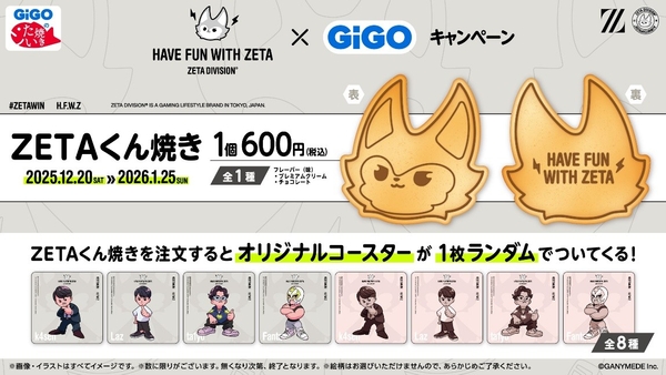 GiGOのたい焼きにて、「ZETAくん」をモチーフにしたコラボたい焼き「ZETAくん焼き」を販売いたします。「ZETAくん焼き」1点ご購入につき、オリジナルコースター(全8種)をランダムで1枚進呈いたします。