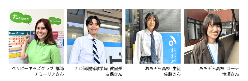 各サービスの教室で行われた撮影には、現役のペッピーキッズクラブの外国人講師、ナビ個別指導学院の教室長、おおぞら高校の生徒・コーチが参加。またペッピーキッズクラブとナビ個別指導学院の生徒役には、それぞれ子役タレントの北原るりさん、與那覇琉生さんが出演しました。ナレーションは俳優・ナレーターの池戸慎之介さんが担当。今回は撮影時のメイキング映像を公開します。