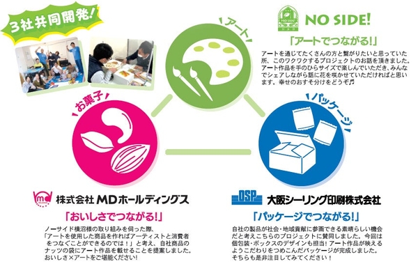 株式会社MDホールディングス(本社:大阪府東大阪市)は、同じ東大阪市を拠点とする株式会社ノーサイド(本社:大阪府東大阪市) が運営する障がい児者総合福祉施設ノーサイド(以下、ノーサイド)の「ひとつなぎプロジェクト」に賛同し、障がいのある方のアート作品を商品パッケージにデザインした「ナッツ&フルーツ アートボックス」を2023年8月1日(火)より、当社オンラインショップにて限定で発売いたします。