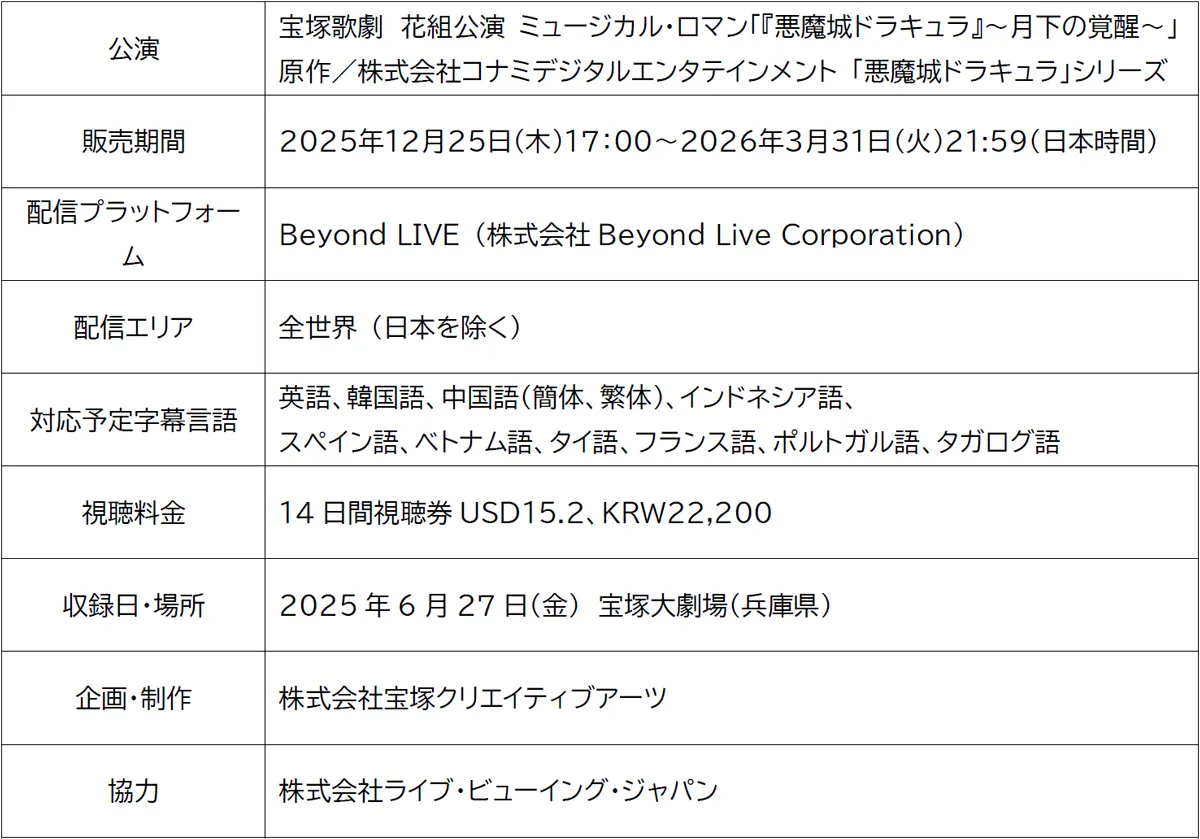 株式会社宝塚クリエイティブアーツ(兵庫県宝塚市)はこのたび、宝塚歌劇 花組公演 ミュージカル・ロマン『悪魔城ドラキュラ』~月下の覚醒~(原作/株式会社コナミデジタルエンタテインメント「悪魔城ドラキュラ」シリーズ ※2025年6月27日 宝塚大劇場(兵庫県)にて収録)を、世界180以上の国・地域へ動画配信(VOD)いたします。