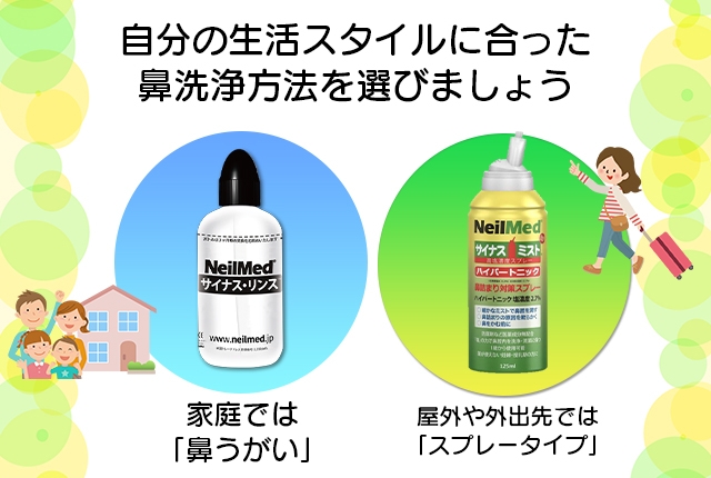 屋外や水が使えず鼻うがいができないときは、スプレータイプの製品であれば持ち運びもしやすく、洗浄後の水による周囲の汚染も防ぎながら適切に上咽頭に高張食塩水を吹き付けることができます。