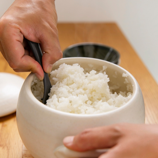 やさしい色合いで、コロンとした形がかわいらしいごはん鍋は、炊きたてをそのまま食卓に出しても、すっとなじんでくれるシンプルなデザインです。