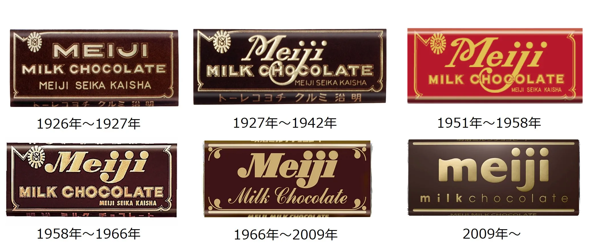 発売時の価格は手が出しづらい高価なお菓子でしたが、CMが放映された1966年頃には比較的お手頃な値段で流通し、より多くの方に手に取っていただける商品になりました。発売から50年を迎える1970年頃には、バレンタインデーが定着してきたと言われています。そして2009年、当社のブランドマークが変わり、43年間続いた「明治ミルクチョコレート」のパッケージも新しくなりました。