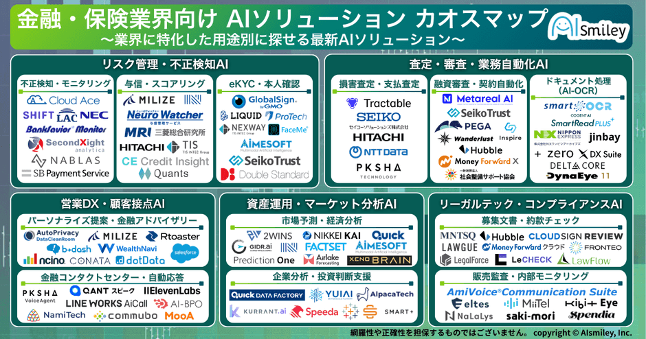 国内最大級のAIポータルメディア「AIsmiley」を運営する株式会社アイスマイリーは、リスク管理の高度化と収益機会の創出を革新する最新AIソリューションをまとめた「金融・保険業界向けAIソリューション カオスマップ」を、2026年1月8日(木)に公開しました。掲載総数96製品です。