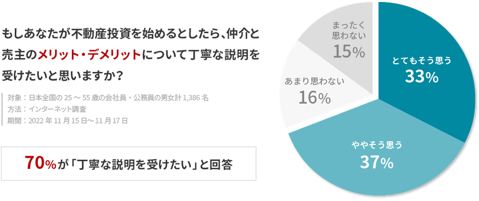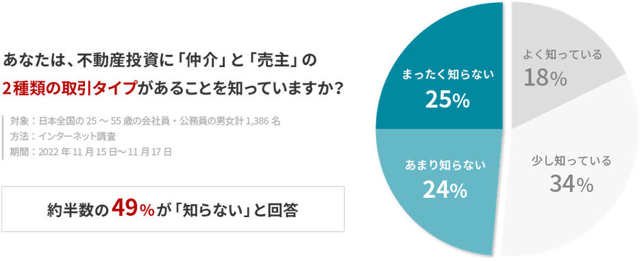 全国の会社員・公務員の男女計1,386名に対して行った今回の調査では、不動産投資の成否に大きな影響を及ぼす「仲介」と「売主」の取引タイプについて、全体の約半数となる49%がその存在自体を認知していないという事実が判明したほか、これらの取引タイプについて、10人中7人が「丁寧な説明」を求めていることが明らかになりました。