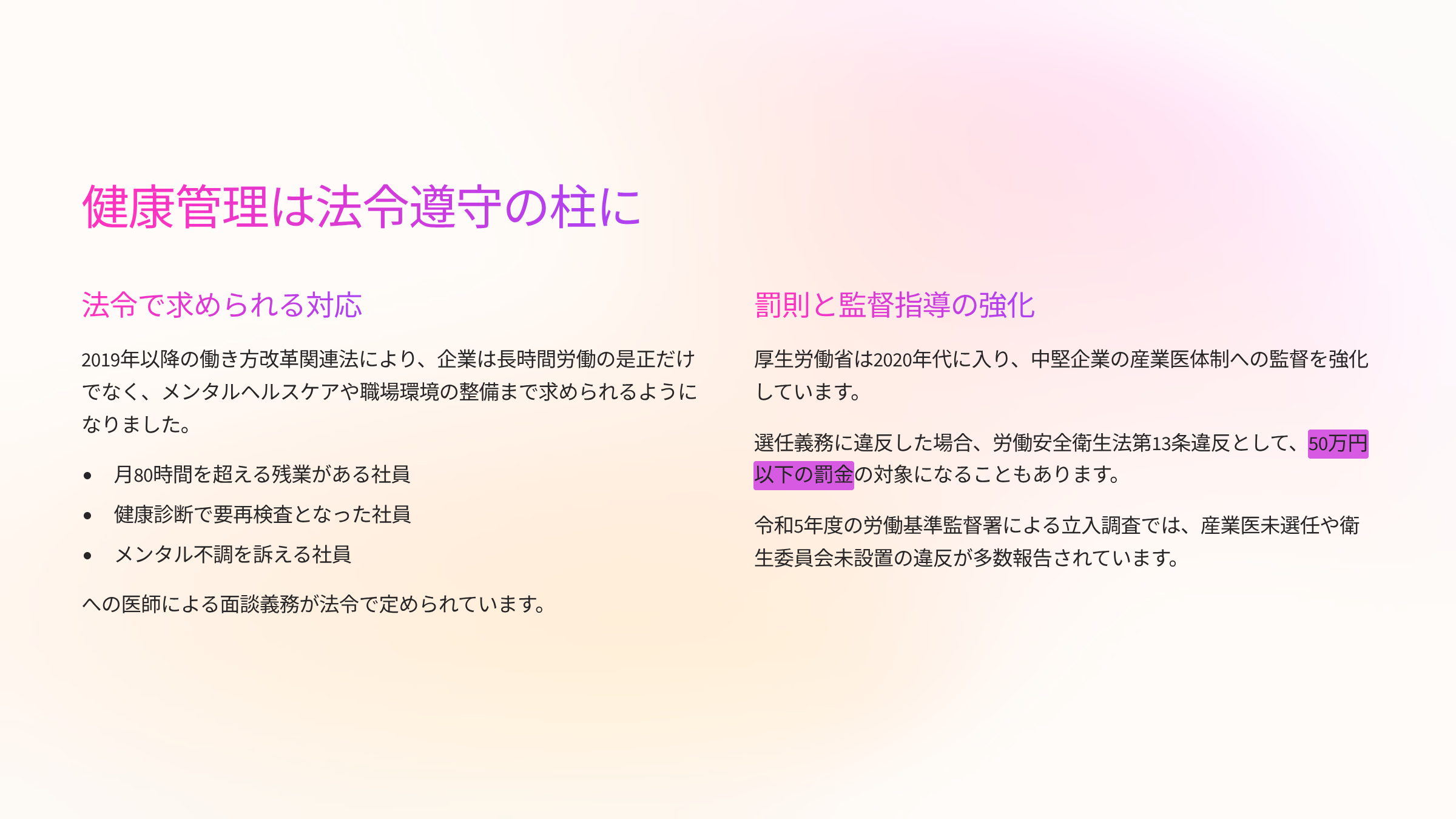 形式的な選任ではなく、「企業と社員を守るために、機能する産業医かどうか」が問われる時代に入っています。