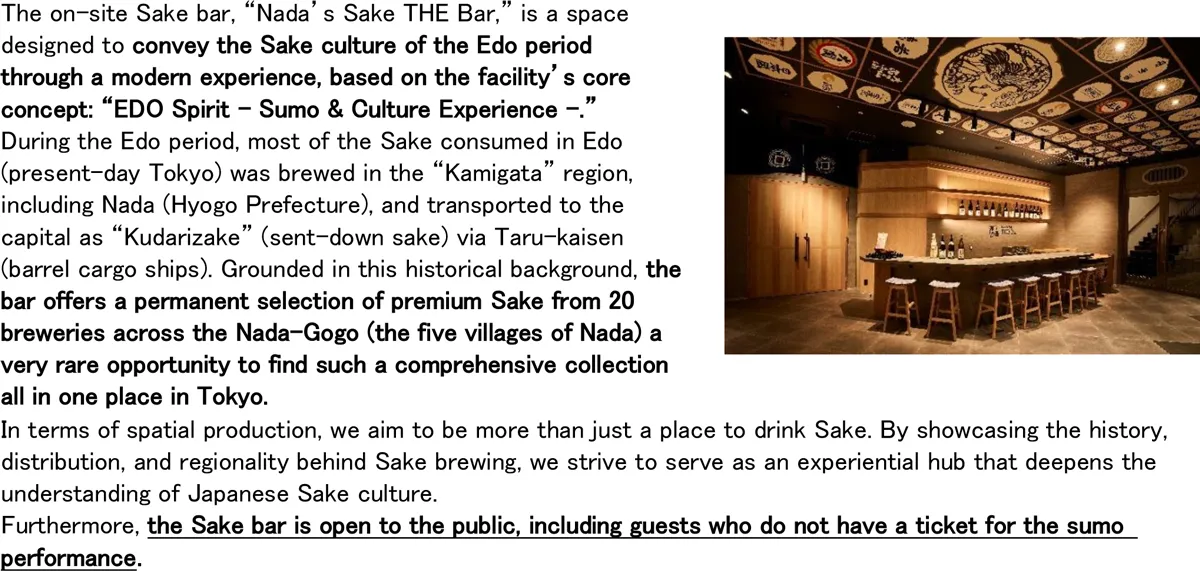 併設する日本酒バー「灘の酒 THE Bar」は、施設コンセプトである「EDO Spirit - Sumo & Culture Experience -」に基づき、江戸時代の酒文化を、現代の体験を通じて伝える空間です。