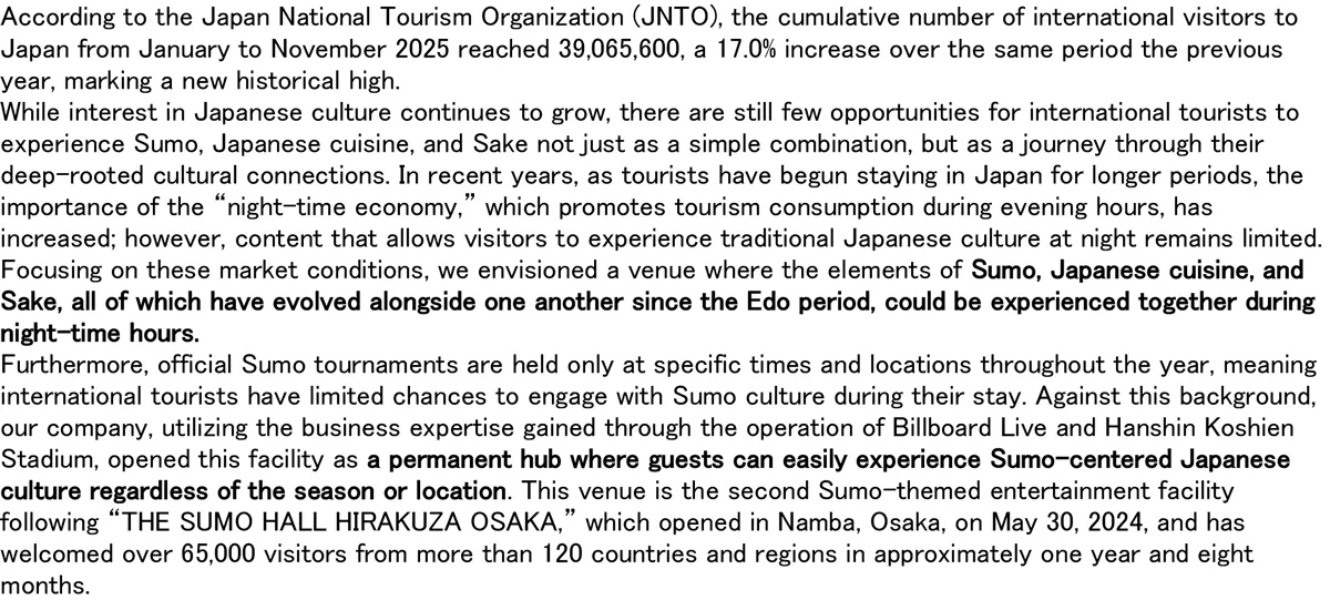 また、公式の相撲観戦は開催時期や場所が決まっており、訪日観光客が滞在中に相撲文化に触れる機会は限定的です。これらの背景を踏まえ、ビルボードライブや阪神甲子園球場の運営等で培ったビジネスノウハウをもつ当社が、時期や場所に左右されることなく、相撲を軸とした日本文化を気軽に体験できる拠点として、本施設を開業しました。なお、本施設は2024年5月30日に大阪・難波で開業し、約1年8か月で世界120を超える国と地域から6万5,000人以上が来場した「THE SUMO HALL 日楽座 OSAKA」に続く、相撲をテーマとしたエンタテインメント施設の2号店です。