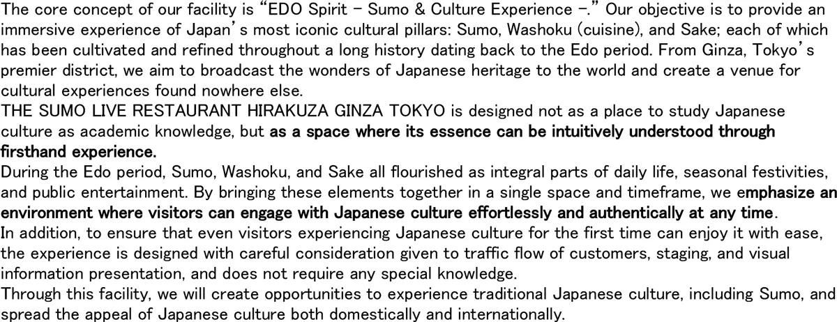 コンセプトは、「EDO Spirit - Sumo & Culture Experience -」。江戸時代から長い歴史の中で育まれ発展してきた、日本を代表する「相撲」「和食」「日本酒」文化を、体験を通じて提供し、その魅力を世界に発信することを目的としています。日本を代表する繁華街である東京・銀座から、日本文化の素晴らしさを伝え、他にはない日本文化体験の場を創出してまいります。