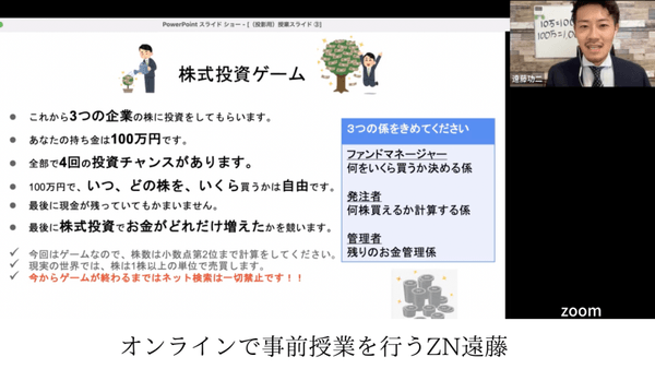 そこで、生徒たちの基礎知識を固めるために、事前授業を行うことになった。講師はZN代表の遠藤だ。証券会社、銀行を経て2020年4月に、FPとして独立している。専門は金融教育だ。「知識がないために損をする人」をたくさん見たことで、教育に興味をもった。「金融業界は、知識が損得を左右する。特に投資の知識は家庭環境による個々の格差が大きい。全国の学生に平等に投資の知識を届けたい。」と語る。