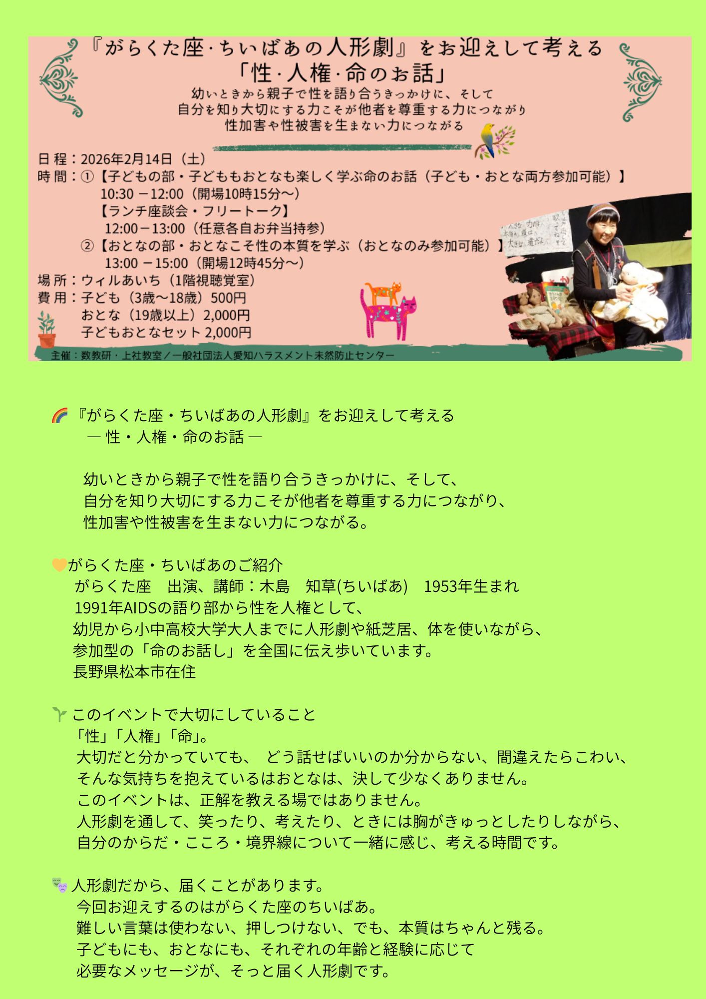 一般社団法人愛知ハラスメント未然防止センター(愛知県/代表 津賀 貴代)では、『がらくた座・ちいばあの人形劇』をお迎えして考える「性・人権・命のお話」をウィルあいち(愛知県名古屋市)にて、2026年2月14日(土)に開催いたします。