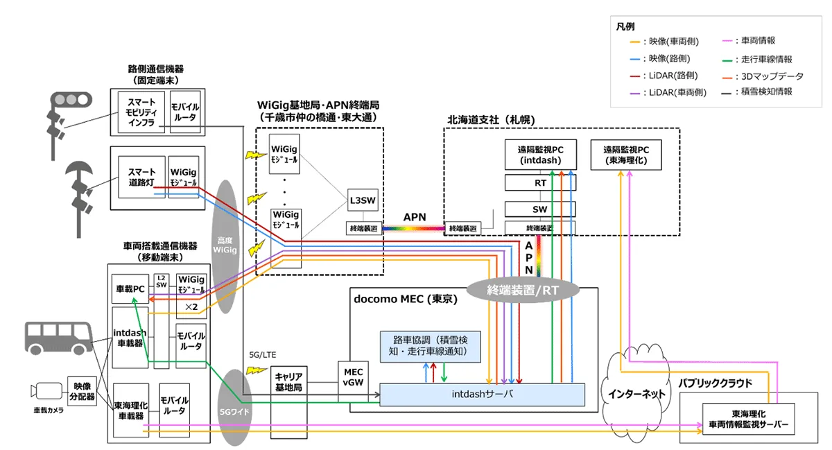 IOWN(R) APNや高度WiGigといった最新の通信技術を活用し、走行中の膨大なセンサーデータを低遅延に伝送する仕組みを検証します。加えて、キャリア5G/LTE回線と5Gワイド※4による優先制御を適用することで、電波状況が変動する環境下でも車両制御に必要な情報を安定的に送受信できることを確認します。また、docomo MEC(R)※5を活用して地域内でデータ処理を行い、積雪や除雪状況を反映した3Dマップを迅速に生成・更新することで、寒冷地における路面状況をきめ細かく把握しながら安全走行を可能とする通信・制御基盤の有効性を検証します。