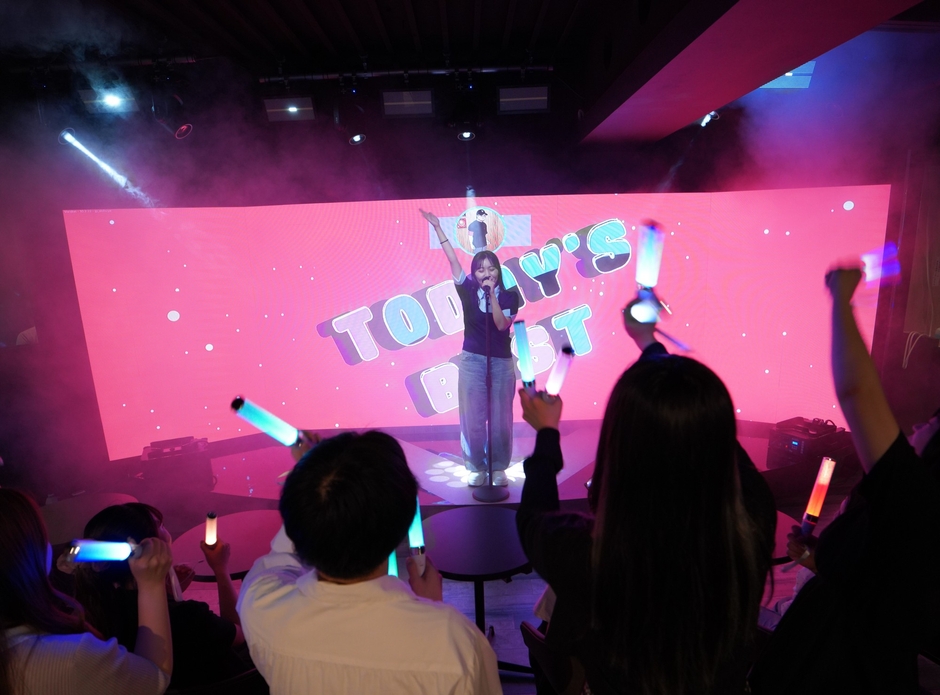 店内中央のステージには、大型LEDと照明演出を完備。まるで本物のライブ会場に立っているかのような臨場感の中で、誰でも自由に歌ってパフォーマンスを楽しめます。