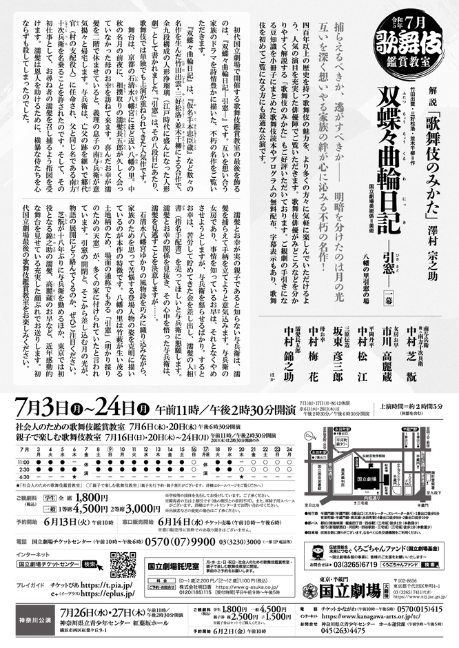 歌舞伎の入門公演として、半世紀以上にわたり延べ650万人を超える方が来場した歌舞伎鑑賞教室。今年10月末からの建て替えによる閉場を控え、初代国立劇場では見納めとなる7月歌舞伎鑑賞教室は、美しい月明かりの夜に仲睦まじい家族に起きた“事件”を情緒豊かに描いた名作を上演します。