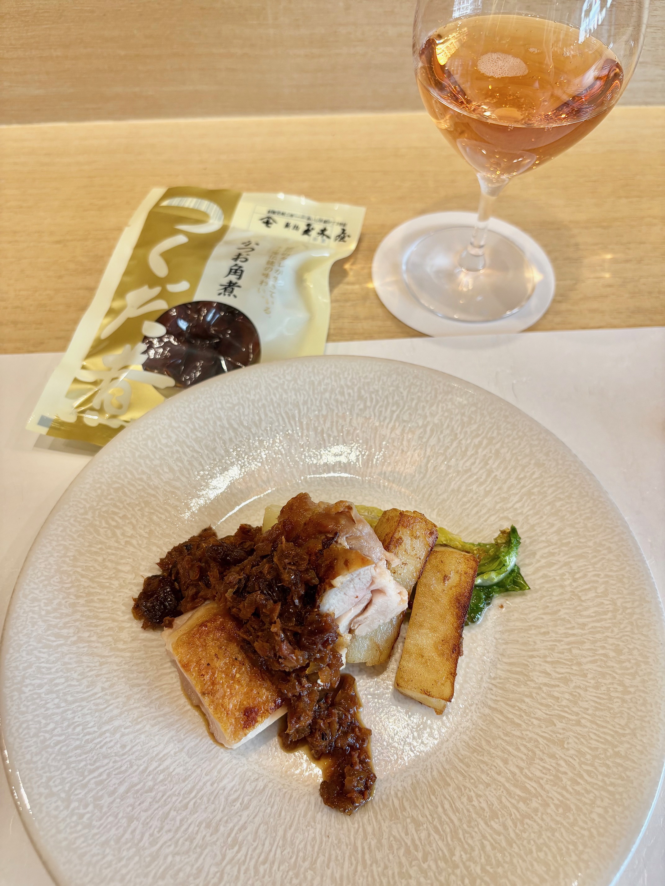 細切昆布と大豆ミートが融合。玉木屋の「細切昆布」をベースに、代替肉ではなく大豆の団子と、飢饉を救ったトマト、海藻を加えた一皿。玉木屋の「あさり佃煮」も使い、その海の旨みが素材をつなぎます。動物性たんぱく質の削減、植物中心の食へのシフト、旬と地域の素材を尊重したシェフの姿勢が表現されています。
