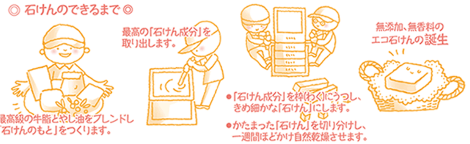 釜炊きした石鹸素地の一番良い部分のみを取り出した「窯出し一番」を使用。溶け崩れの少ない硬い石鹸に仕上げることができる「枠練り法」を採用し、手作業で攪拌し長時間かけて冷却。そうすることで、不純物をしっかり取り除くことができます。