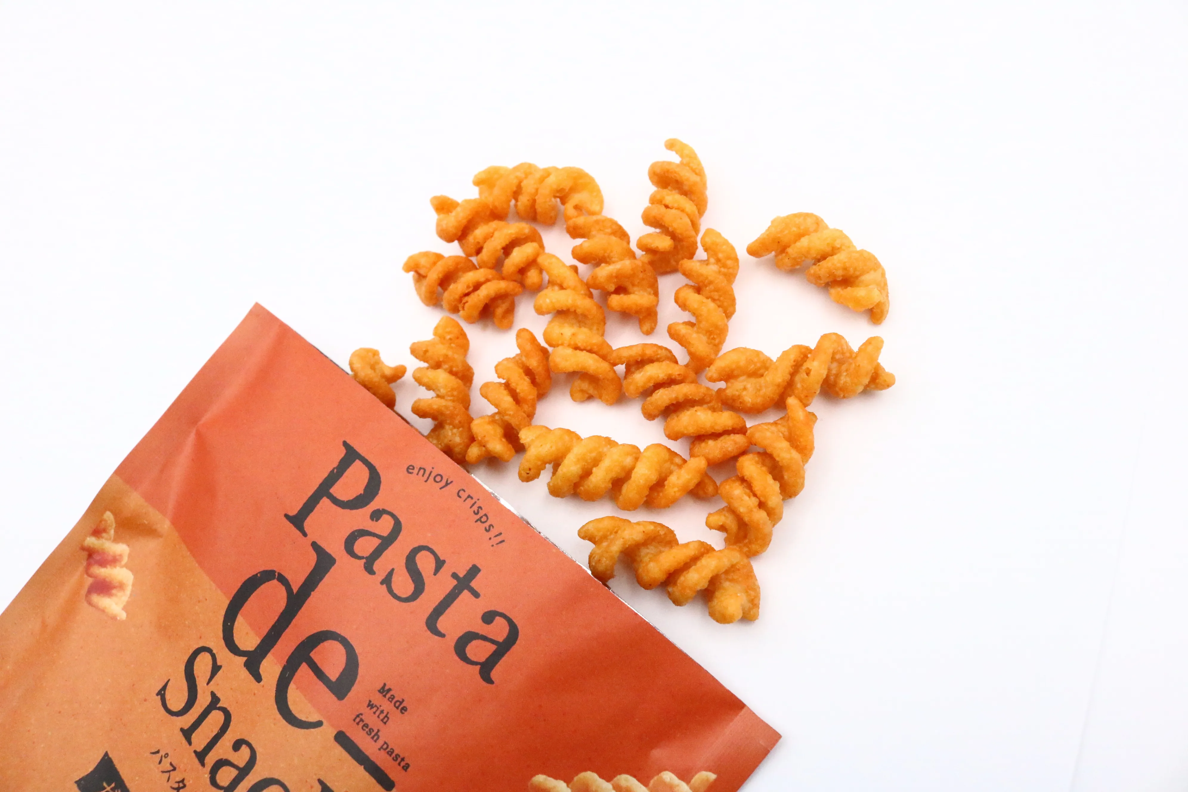 つまみやすいフジッリ型と濃い目の味付けが特長でお酒のおつまみに最適です。洋酒からノンアルコールドリンクまで、幅広い飲料に合わせやすい味わいです。全部で5種類のフレーバーを展開しています。