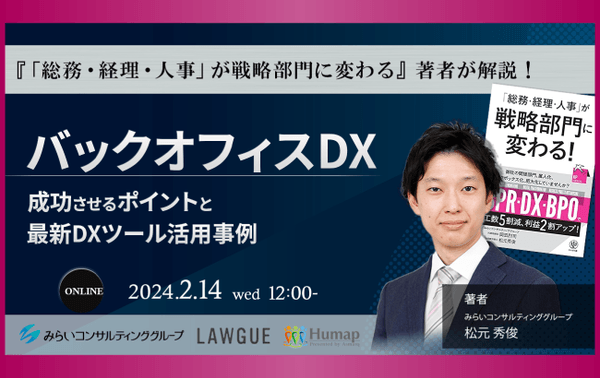 みらいコンサルティンググループ(本社:東京都中央区、代表:久保 光雄 岡⽥ 烈司)は、セミナー「バックオフィスDXを成功させるポイントと最新DXツール活用事例」を2024年2月14日にWEBにて開催いたします。