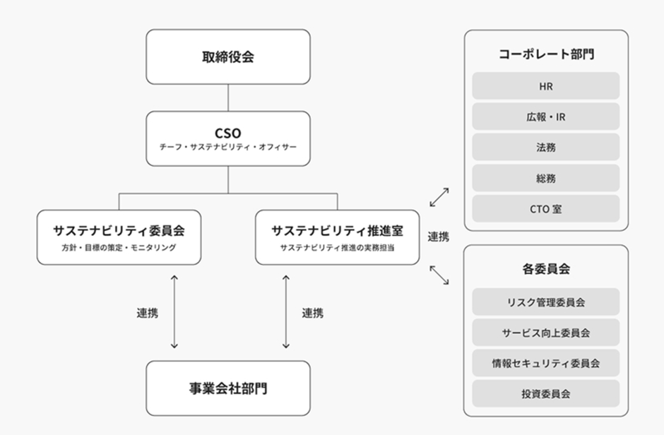 チーフ・サステナビリティ・オフィサー(CSO)を委員長とし、代表取締役、部門責任者、社外取締役によって構成される「サステナビリティ推進委員会」を設置し、サステナビリティに関する方針・目標の策定や、マテリアリティの検討、推進、改善計画の審議を行います。2025年1月に新設した「サステナビリティ推進室」では、決定された施策の実行実務、ならびに進捗状況のモニタリング、レビューを行います。