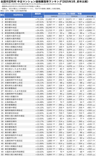 「マンションレビュー」2025年3月 全国市区町村 中古マンション価格/騰落率ランキングを発表