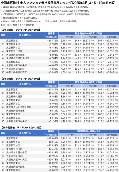 「不動産×WEB×ビッグデータ」の領域で、さまざまな不動産テックサービスを展開する株式会社ワンノブアカインド(本社:東京都港区、代表取締役社長:川島 直也、以下当社)は、当社が運営するマンション情報サイト「マンションレビュー」の保有データを元に、2025年3月の全国市区町村における中古マンションの相場を調査。坪単価をベースに70㎡の価格に換算した「中古マンション価格」*1と価格ランキング上位20件について過去10年間の価格推移、および1年前からの価格上昇率を表す「騰落率」のランキングを発表いたします。