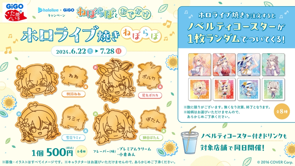 GiGOのたい焼きにて、ホロライブとのコラボたい焼き 「ホロライブ焼き~ねぽらぼ~第2弾」を販売いたします。1個お求めの方に、オリジナルコースター(全8種/ランダム)を1つプレゼント!
