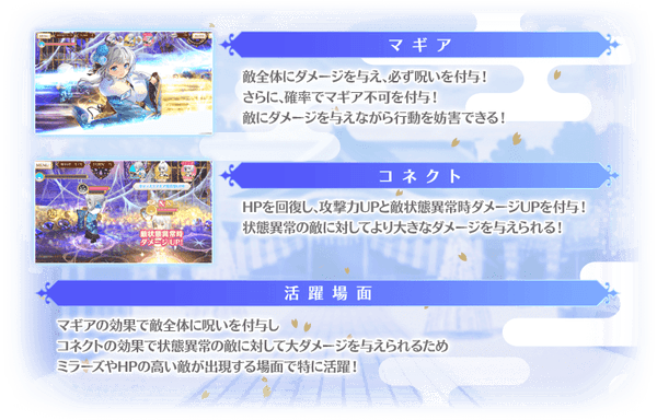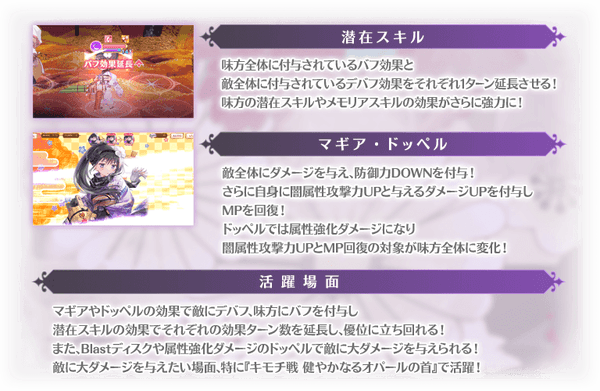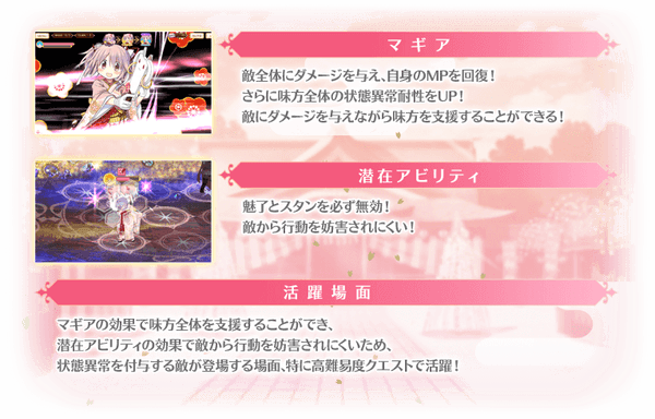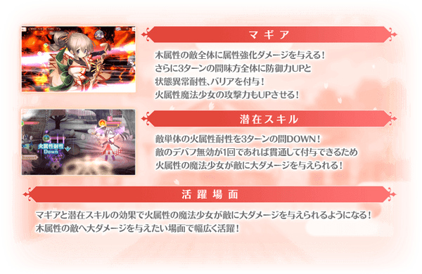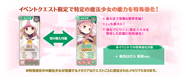 対象の魔法少女を編成して本イベントクエストをプレイする際にステータスを特殊な状態に強化することができます。