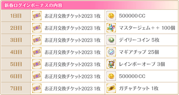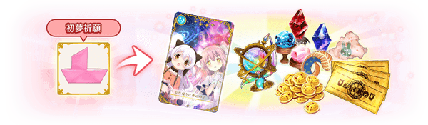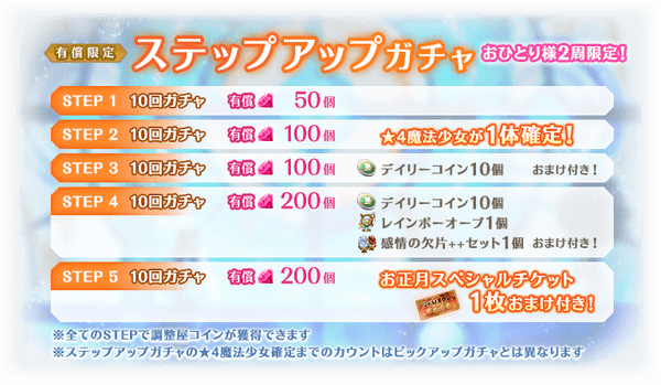 各STEPに応じて、消費する有償マギアストーンの個数や、獲得できるおまけが異なりSTEP5では対象の★4魔法少女1体や★4メモリアと交換できる「お正月スペシャルチケット」が獲得できます。