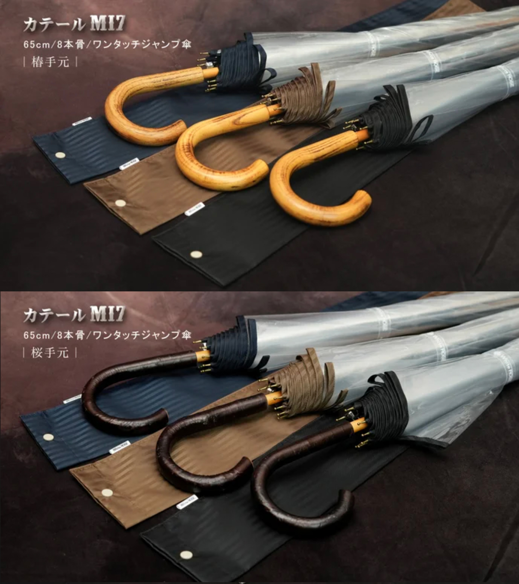 「カテール16 AGENT」の手元は、牛革と椿天然木の2種類。高級感漂う逸品です。「カテールMI7」の手元は、椿天然木と桜然木の2種類。天然木は5年10年と使い続けることにより、手にシックリと馴染んできます。
