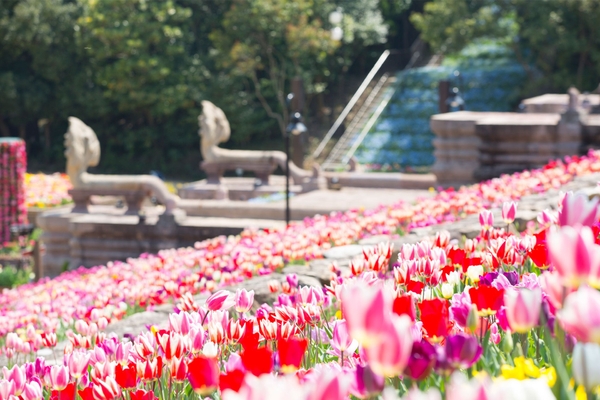 1年を通してさまざまな季節の花を楽しめるレオマ花ワールド。毎年恒例の春のイベント「チューリップ祭」が開催され、約7万本のチューリップとビオラがフラワーガーデンを彩り、見ているだけで気分も明るくしてくれます。また、レオマリゾートならではの、チューリップ畑×亜細亜の復元遺跡のコラボレーションも見どころのひとつ。