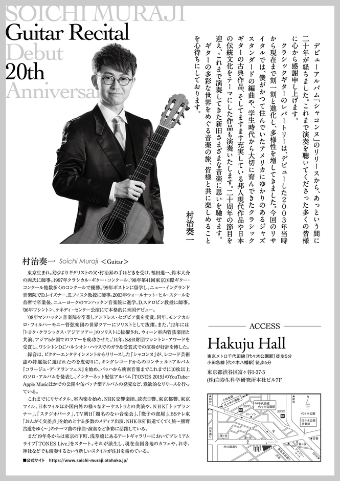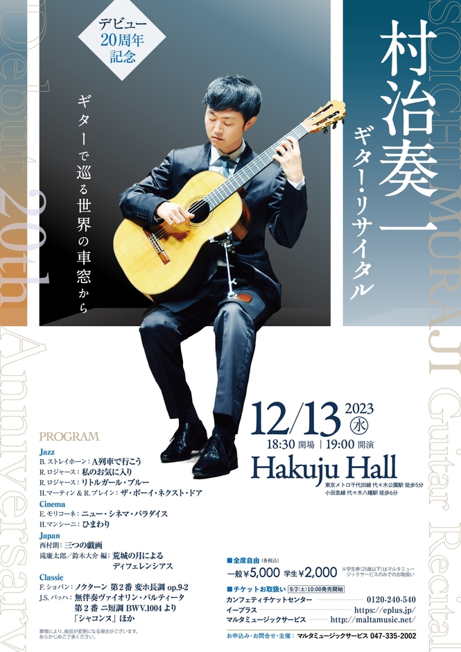 デビュー20周年記念『村治奏一ギター・リサイタル』が2023年12月13日 (水)にHakuju Hall(東京都渋谷区富ヶ谷1-37-5(株)白寿生科学研究所本社ビル 7F)にて開催されます。