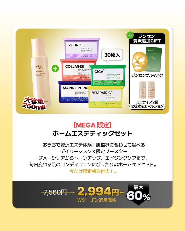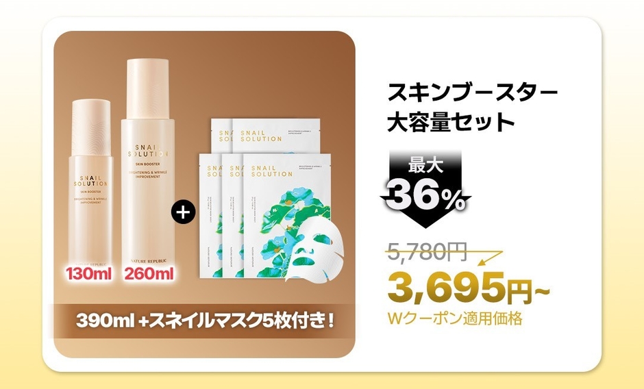 ネイチャーリパブリック定番のスネイルソリューションシリーズの中でも特に人気のブースターに、肌悩みに合わせて選べるシートマスク&限定特典がついたセットが登場。