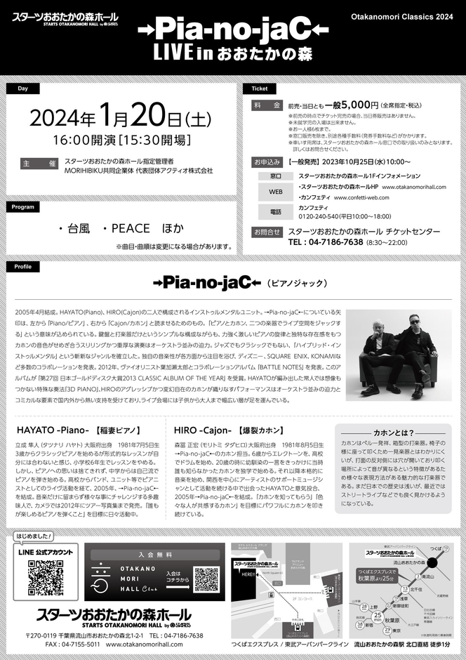 スターツおおたかの森ホール指定管理者MORIHIBIKU共同企業体 代表団体アクティオ株式会社主催、『→Pia-no-jaC← LIVE in おおたかの森』が2024年1月20日 (土)にスターツおおたかの森ホール(千葉県流山市おおたかの森北1-2-1)にて開催されます。