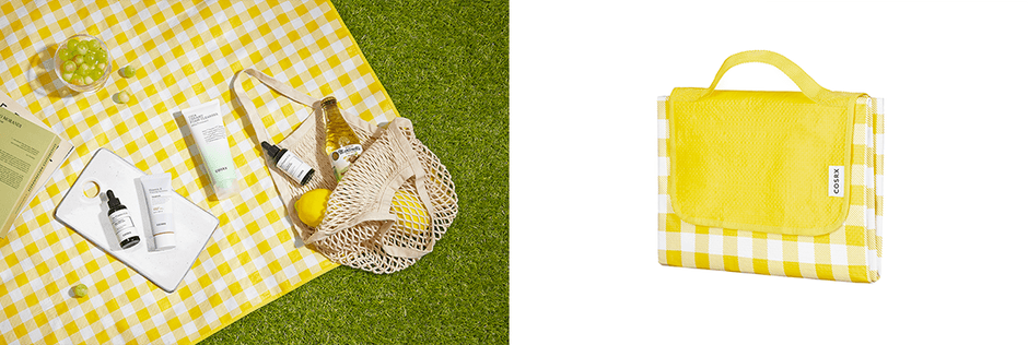 COSRXらしい、ビタミンカラーがかわいいレジャーシート。持ち運びに便利な取っ手付き。