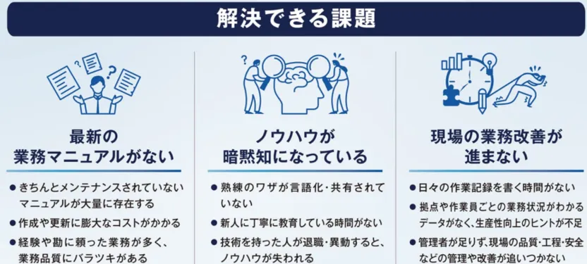 日本では、製造業・建設業における現場の保守点検をはじめとするフィールドワーカー領域において、労働力不足(*1)と、それに伴う熟練技術の継承難が喫緊の課題となっています。