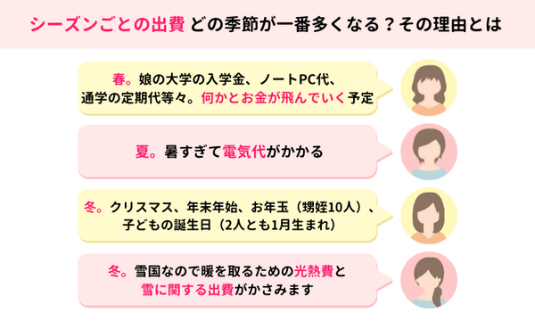 ママたちのコメントから、冬は「生活必需費+イベント出費+気の緩み」という“出費が膨らむ条件”がすべて揃う季節であることがわかりました。また秋は出費が落ち着くという傾向から、”お金を貯めやすい季節“でもあると言えます。
