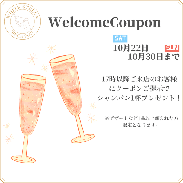 期間中17時以降にご来店いただいたお客様には、シャンパンを1杯プレゼントさせていただきます💕(お一人様ワンオーダー必須です。)