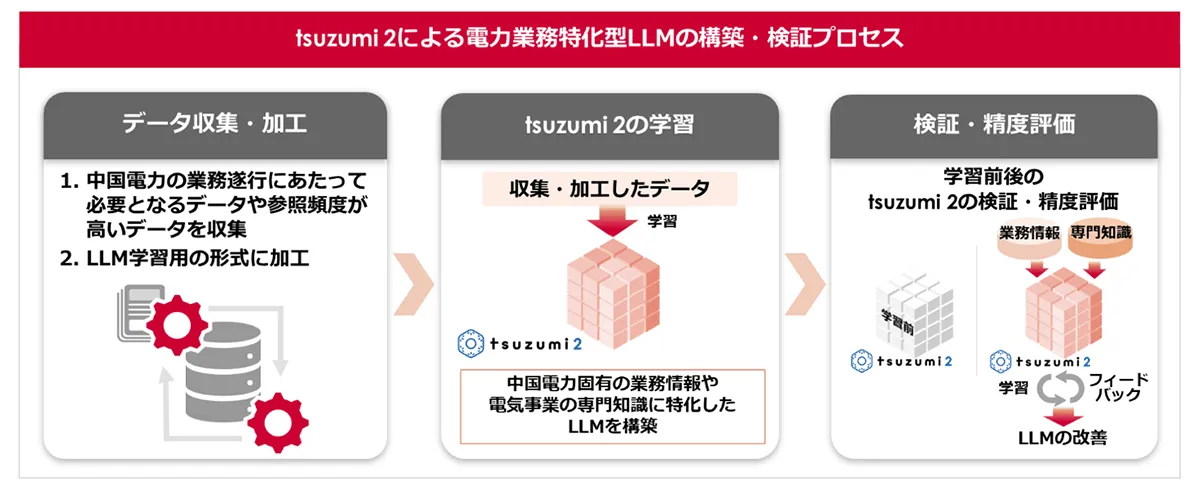 本取り組みでは、「tsuzumi 2」に中国電力の業務情報やノウハウなど、実務的な観点で選定したデータを学習させることで、電力業務に特化したLLMの構築と検証を実施します。本年1月から3月末にかけて次のプロセスで取り組み、構築したLLMの精度等を踏まえて2026年度以降の実用化を目指します。