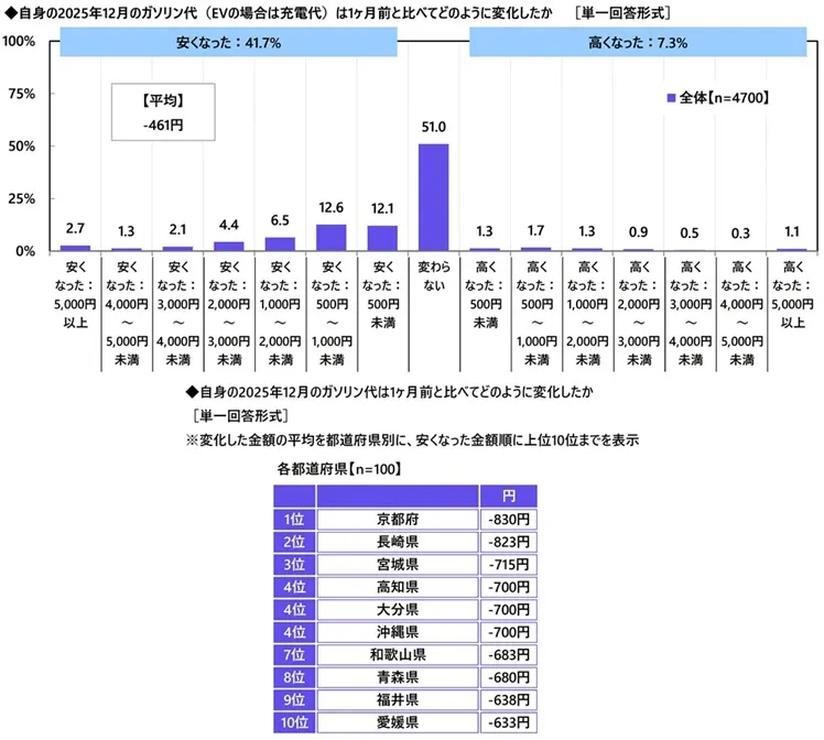 自身の2025年12月のガソリン代(EVの場合は充電料金)は1ヶ月前と比べてどのように変化したか聞いたところ、「安くなった」は41.7%、「変わらない」は51.0%、「高くなった」は7.3%となり、平均は-461円(461円安くなった)でした。