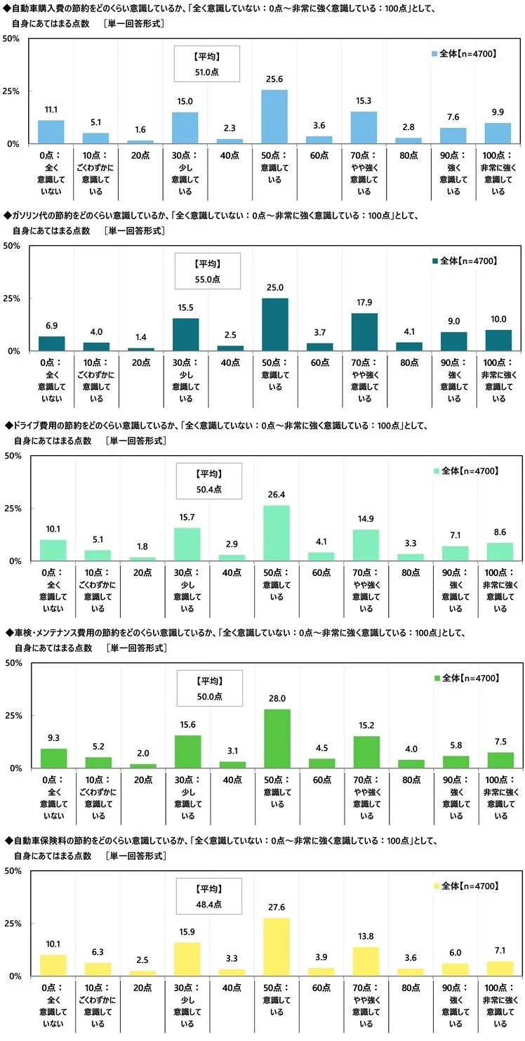 次に、カーライフにおける節約をどのくらい意識しているか、「全く意識していない:0点~非常に強く意識している:100点」として、節約意識度の自己評価を聞いたところ、【自動車購入費の節約(例:中古車を選ぶ、軽自動車を選ぶ、値引き交渉する など)】では「50点:意識している」(25.6%)に最も多くの回答が集まったほか、「30点:少し意識している」(15.0%)や「70点:やや強く意識している」(15.3%)にも回答が集まり、平均は51.0点でした。その他の項目でも同様の傾向がみられ、自己評価の平均をみると、【ガソリン代(EVの場合は充電代)の節約(例:安いガソリンスタンドを利用する、エコドライブ(省燃費運転)を心がける、エアコンの使用を控える など)】では55.0点、【ドライブ費用の節約(例:高速道路の利用を控える、高速道路は割引がある時間帯に利用する、安い駐車場を利用する など)】では50.4点、【車検・メンテナンス費用の節約(例:安い整備工場を利用する、こまめにメンテナンスする、洗車は自分でする など)】では50.0点、【自動車保険料の節約(例:安い保険に切り替える、補償内容を見直す など)】では48.4点でした。